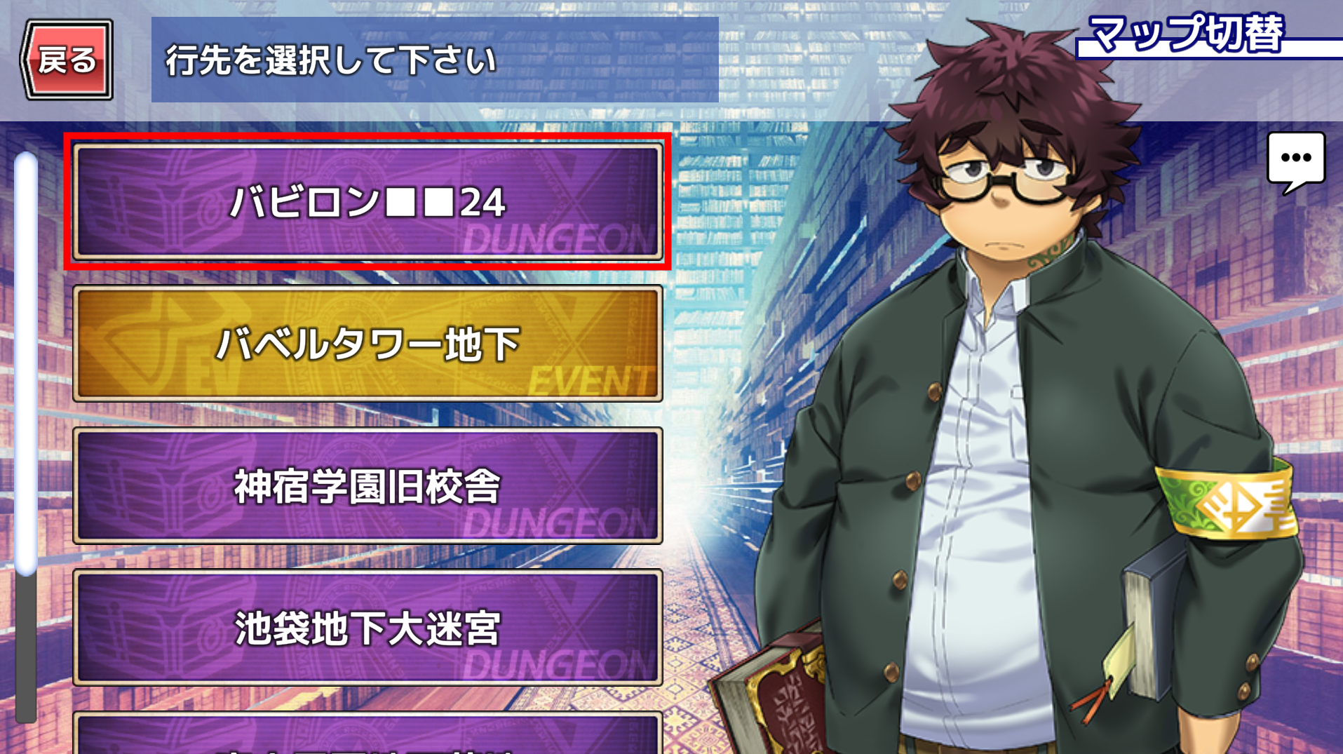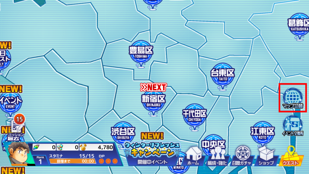 ①クエスト画面から「マップ切替」のボタンをタップ