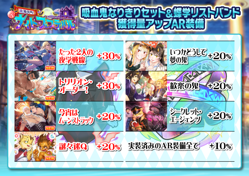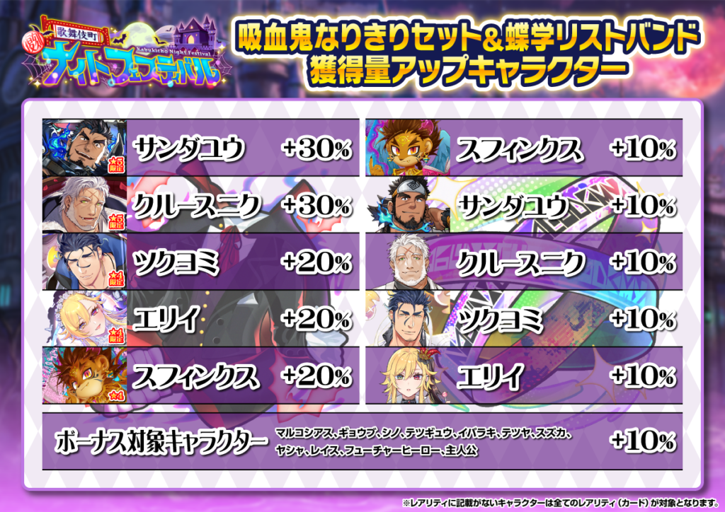 「【復刻】歌舞伎町ナイトフェスティバル」では特定のキャラクター、AR装備でバトルをクリアすると、イベント交換アイテム「吸血鬼なりきりセット」と「蝶学リストバンド」のドロップ数が増加します。