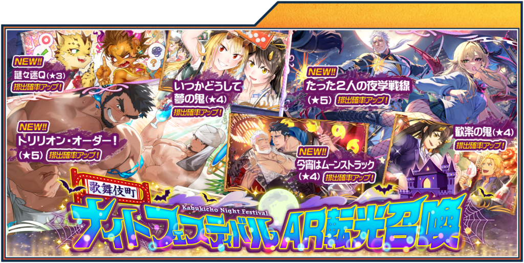 期間限定イベント「【復刻】歌舞伎町ナイトフェスティバル」開催! │ 攻略のヒント │ 期間限定「【復刻】歌舞伎町ナイトフェスティバル転光召喚」開催! │ 新規追加!「歌舞伎町ナイトフェスティバルAR転光召喚」開催! │ 「歌舞伎町ナイトフェスティバル 特殊クエスト」復刻! │ 「歌舞伎町ナイトフェスティバル 高難易度クエスト」復刻! │ 新規キャラクエスト実装! │ 新規スキル特定進化クエスト実装! │ 予告動画