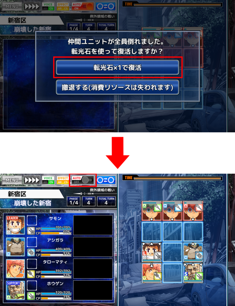 仲間全滅後に復活した場合は、オートバトルがOFFの状態で再開されます。