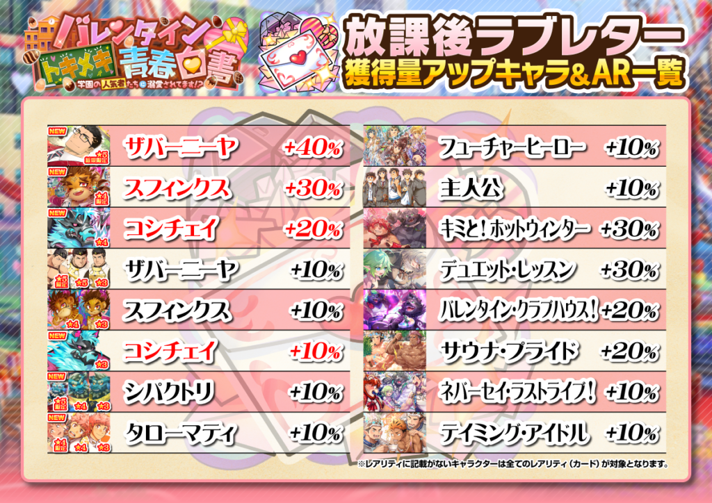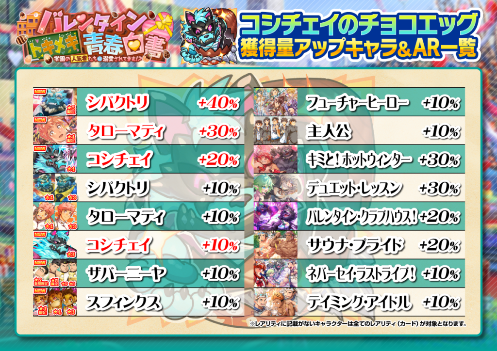 バレンタイントキメキ青春白書 ~学園の人気者たちに溺愛されてます!?~では特定のAR装備やキャラクターと一緒にバトルをクリアすると、イベント交換アイテム「コシチェイのチョコエッグ」と「放課後ラブレター」のドロップ数が増加します。