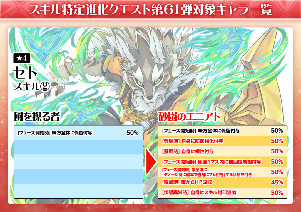 - 技能進化對象:賽特(★4) 完成"「嵐の導き」の挑戦(1)"後,即可將「操縱風暴者」進化為「砂風のエニアド」!