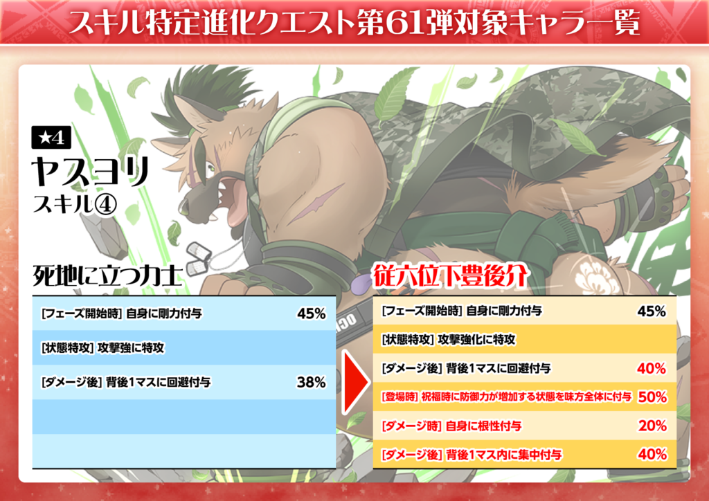 - 技能進化對象:悌順(★4) 完成"「悌の八犬士」の挑戦(2)"後,即可將「立於生死關頭的力士」進化為「従六位下豊後介」!