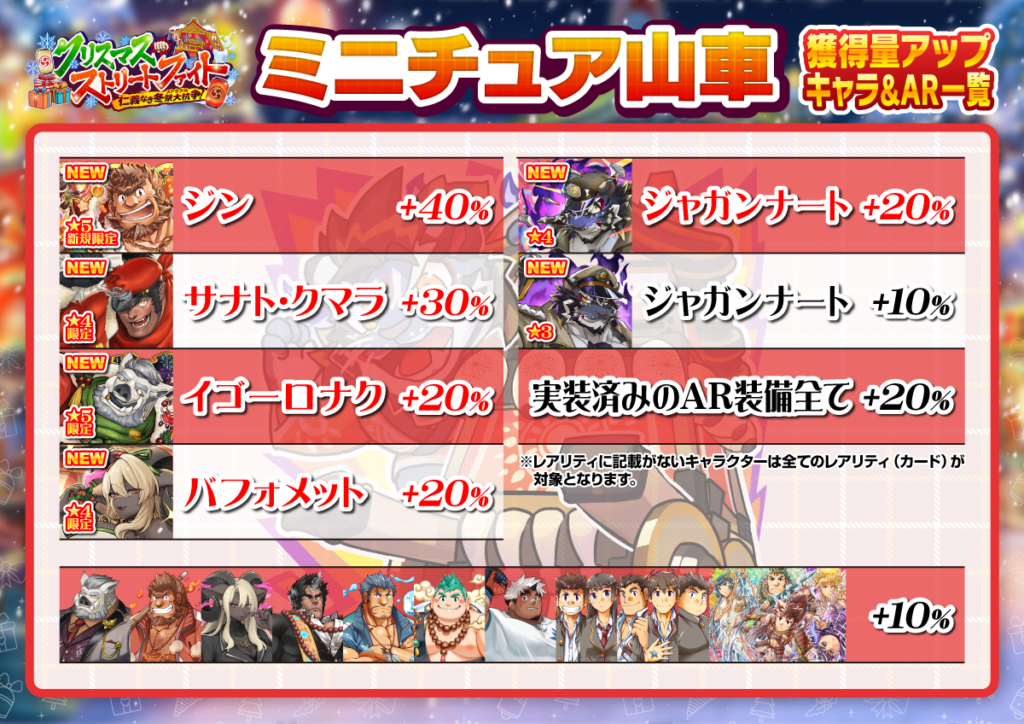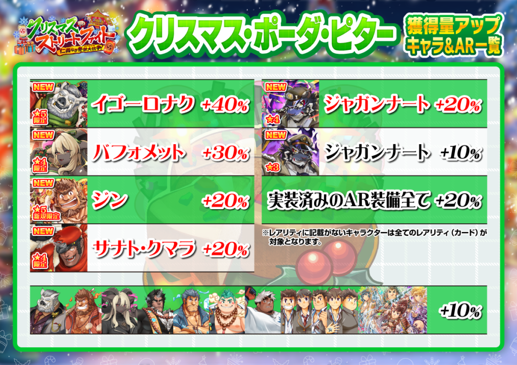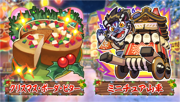 「クリスマス・ストリートファイト ~仁義なき冬祭大抗争!~」では特定のAR装備やキャラクターと一緒にバトルをクリアすると、イベント交換アイテム「クリスマス・ポーダ・ピター」と「ミニチュア山車」のドロップ数が増加します。