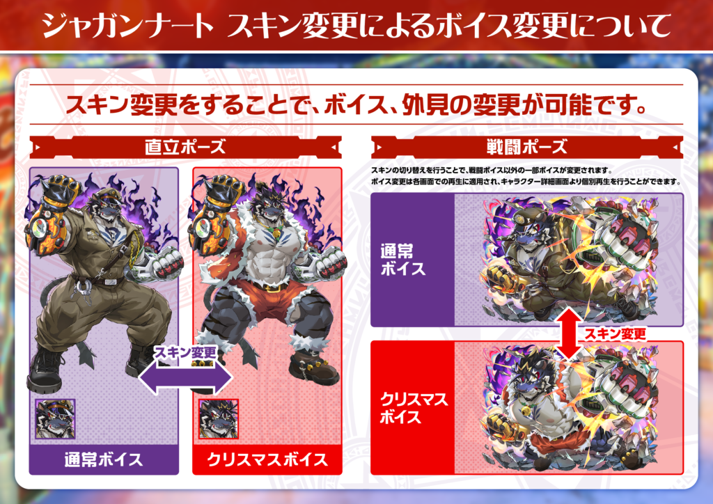 「ジャガンナート」のキャラクターカードのスキン変更をすると、「クリスマス」のボイスへ切り替えることができます。 詳しくは以下をご確認ください。