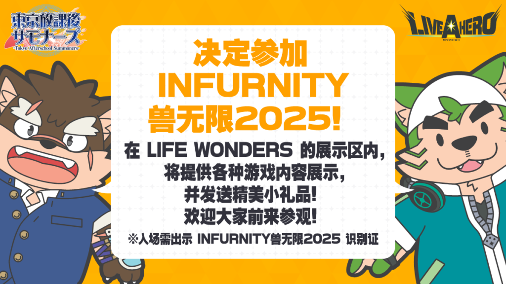 为纪念参加 “Infurnity-兽无限”,全新 “东京放学后召唤师 / Live A Hero!角色亚克力立牌” 将于2025年11月1日(六)起于 LIFEWONDERS SHOP 官方商城开始贩售!